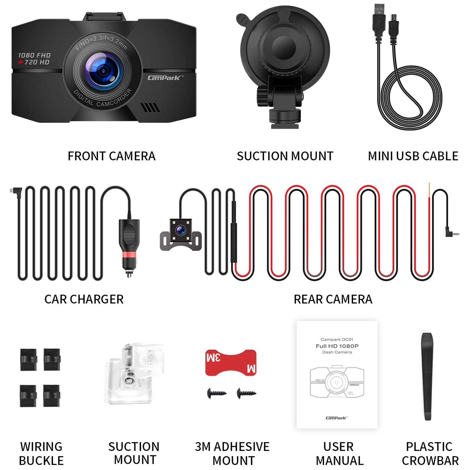 Front camera, Rear camera, Car charger, Suction mount, Mini USB cable, Wiring buckle, Suction mount, 3M adhesive mount, Plastic crowbar, User manual