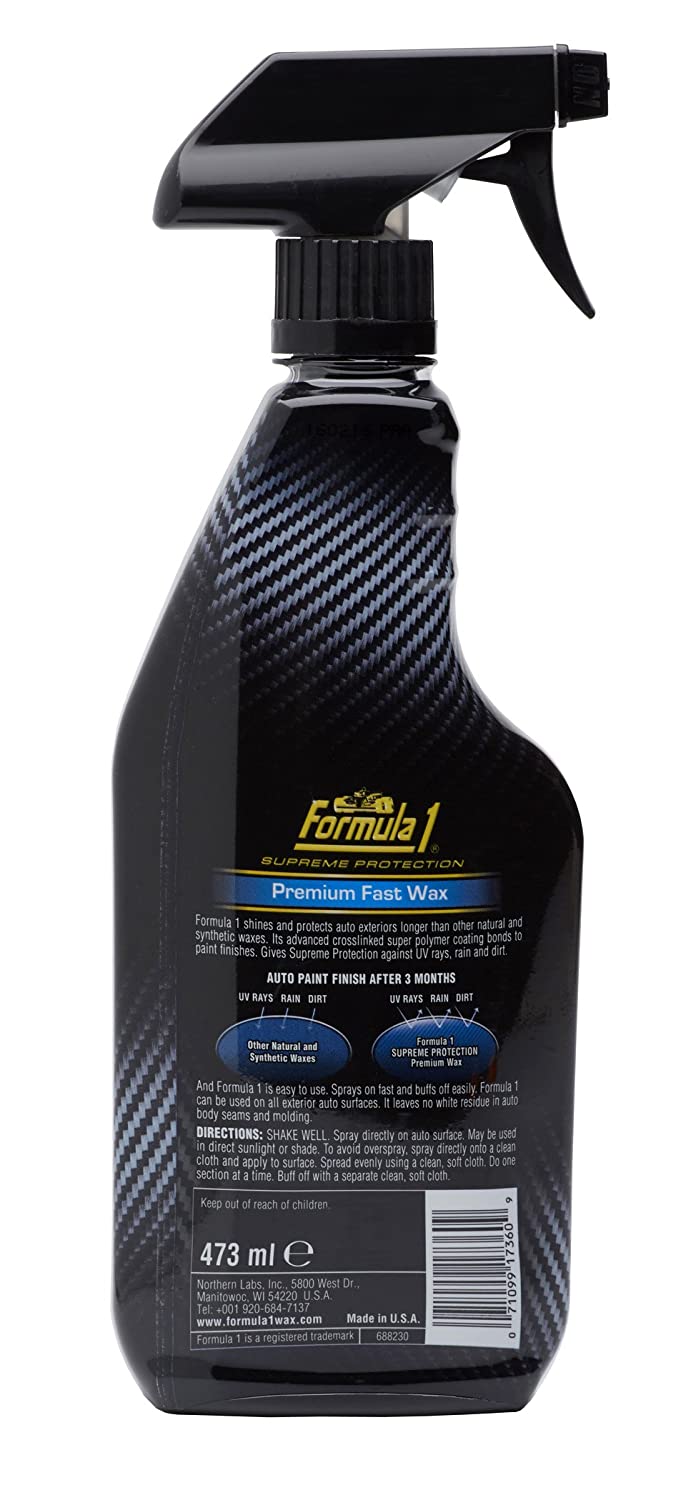 When applied on the car, the super polymers crosslink to form a clear durable coating. It Bonds to paint finish making a lasting barrier against environmental damages. In long term testing, Formula 1’s cross-linked super polymer coating lasted over 2 times longer than other waxes. It’s Fastest, easiest way to get super polymer shine and protection. Just spray on all exterior surfaces, except windows and wipe off. No buffing is required and leaves a brilliant shine and lasting protection.