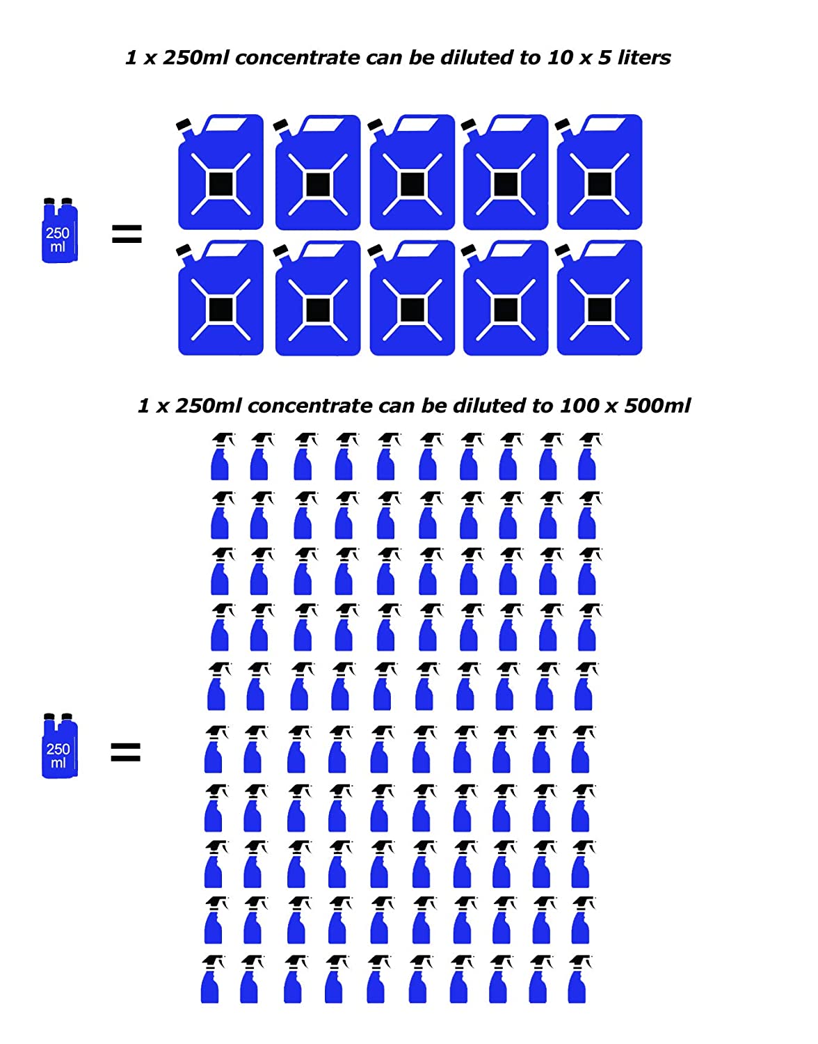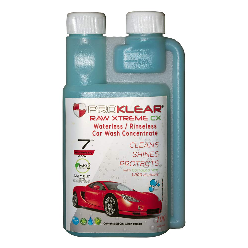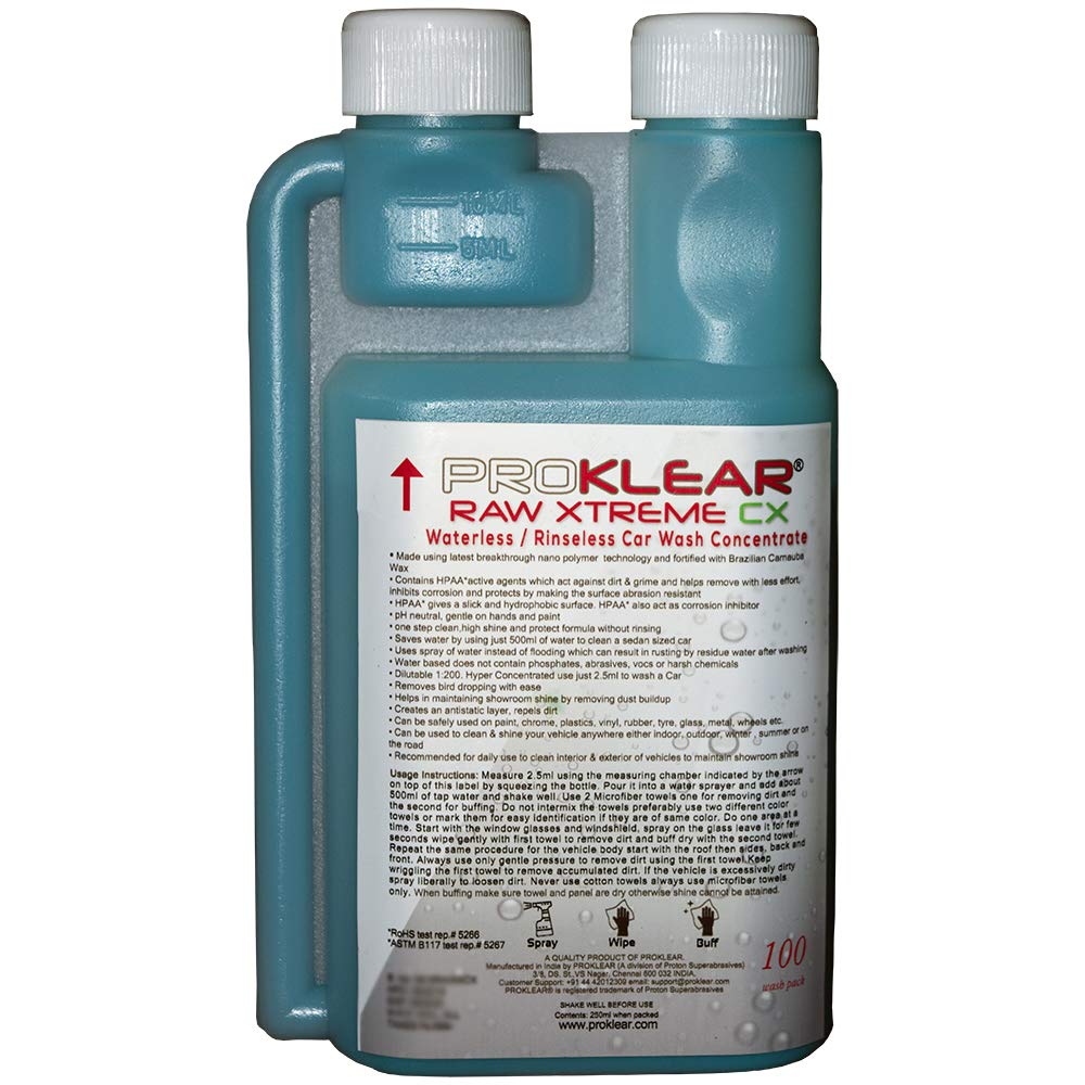 ProKlear Rinseless waterless wash concentrate with carnauba wax proklear RAW xtreme CX is a rinseless waterless wash concentrate. A sedan sized car can be cleaned and waxed with just 5ml of the concentrate and 500ml water. Active agents which lift dirt and grime from pores of the surface, encapsulates them and provides lubrication so that the dislodged dirt cannot redeposit or cause damage while cleaning. The product can be used to clean exterior and interior paint, plastics, glass, vinyl, tyres, wheels, etc except fabric. This is the best product that will easily last you 6-12 months based upon your usage and saves a lot of water.
