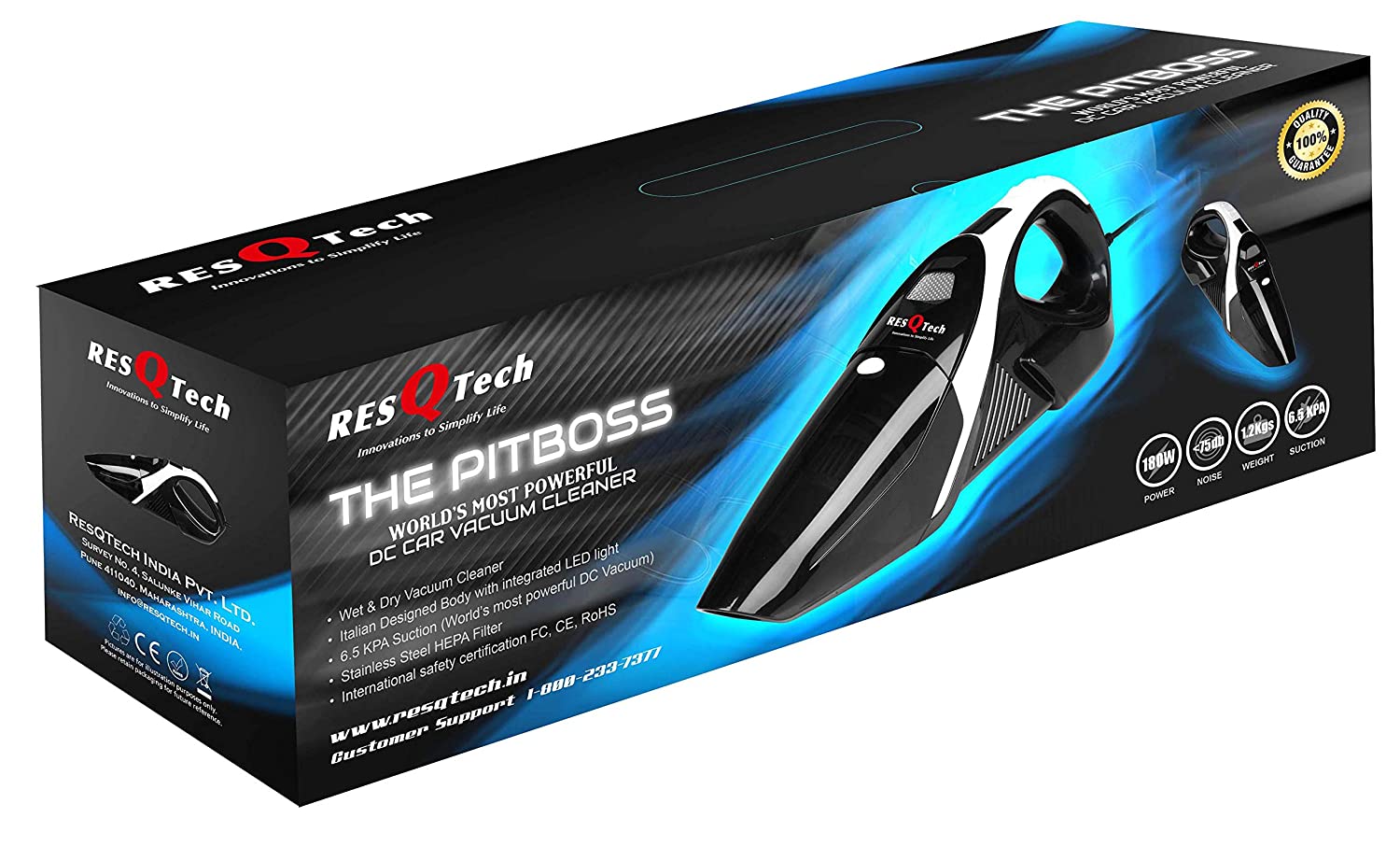 ResQTech car vacuum supports dry and wet use ideal to clean the dust, sand , dirt, cigarette ash , crumbs, pet hair, water etc in the car. It’s a good light weight vacuum for the car with extra long wire for ease of use. Picks up all the dirt from seat floor. It’s one of the Best looking Car Vacuum Cleaner in India and comes with genuine 2 year warranty. Sadly it comes with only one attachment and a brush to clean the fine dust would have been better.